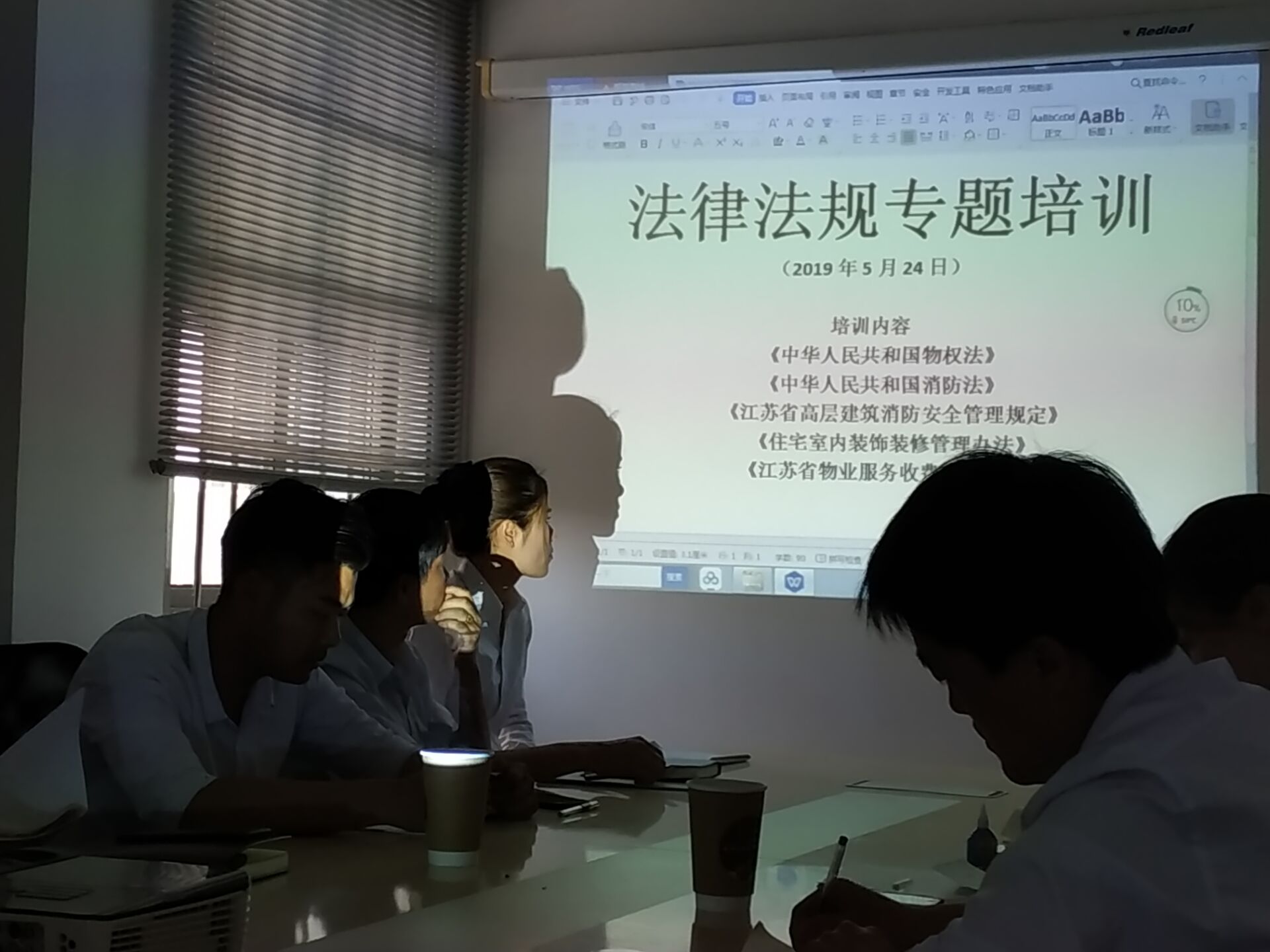 本次培訓(xùn)的內(nèi)容主要有:《中華人民共和國物權(quán)法》、《中華人民共和國消防法》、《江蘇省高層建筑消防安全管理規(guī)定》 、 《住宅室內(nèi)裝飾裝修管理辦法》 《江蘇省物業(yè)服務(wù)收費管理辦法》等五部法律法規(guī)。