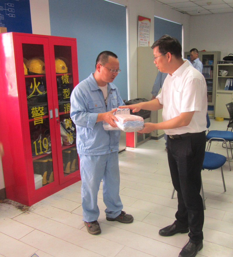 近日持續(xù)高溫, 8月18日下午,產控集團董事長張劍橋前往江山農化、江天化學、醋酸化工等企業(yè)慰問堅守生產崗位的一線職工,送去毛巾、藿香正氣液、仁丹、風油精等防暑降溫物資。