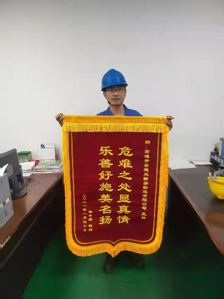 涓涓熱血,匯注生命希望,點滴真情,架起愛的橋梁。9月6日上午,金通靈精密制造有限公司迎來了一位特殊的客人——施先生,將一面寫著“危難之處顯真情,樂善好施美名揚”的錦旗送到我司三車間員工王棟手中,感謝他在緊急關(guān)頭無償獻(xiàn)血,幫助施先生的家庭重獲希望。