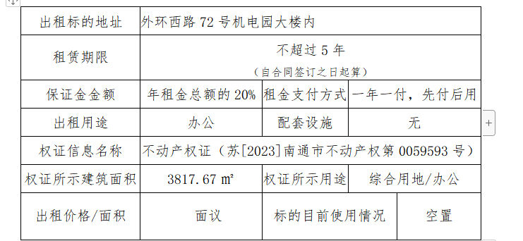 南通國泰創(chuàng)業(yè)投資有限公司所托管園區(qū)外環(huán)西路72號機(jī)電園,已由南通三玖企業(yè)管理服務(wù)有限公司中標(biāo)負(fù)責(zé)整體招商運營管理,擬打造成“產(chǎn)業(yè)研發(fā)、辦公及配套商業(yè)”的總體格局,即日起公開對外招租。 一、出租標(biāo)的信息