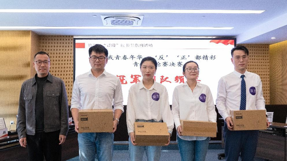 頒獎(jiǎng)環(huán)節(jié)公布了好書薦閱活動(dòng)中投票前十名的選手,他們將獲得集團(tuán)黨委書記《帶著工匠精神去工作》贈(zèng)書一本。吳玉祥為在“好書漂流、愛(ài)心無(wú)限——跳蚤書市”活動(dòng)中,個(gè)體捐書121本的來(lái)自制劑生產(chǎn)公司的陳帝舒頒發(fā)了精華捐書達(dá)人獎(jiǎng)。周云中為正方越琢磨越隊(duì)頒發(fā)了亞軍團(tuán)隊(duì)獎(jiǎng)。尹紅宇為反方傳承精華隊(duì)頒發(fā)了冠軍團(tuán)隊(duì)獎(jiǎng)以及為正方二辯郭佳燕頒發(fā)了最佳辯手獎(jiǎng)。